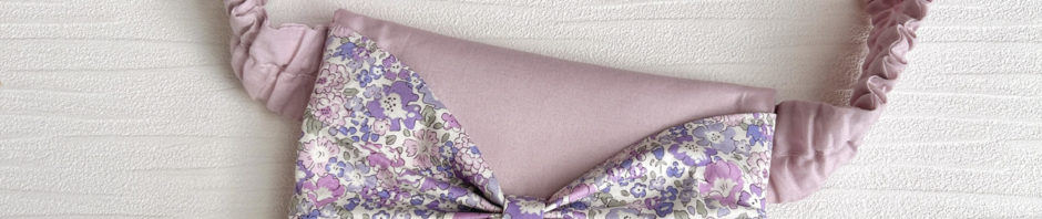 リバティプリントの”ミシェル”を大きなリボンにした移動ポケットに、新色のパープルが新登場です”!
